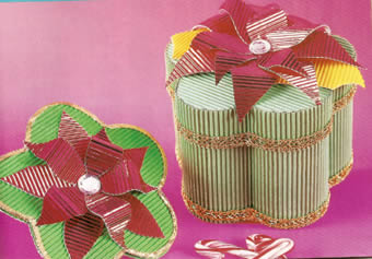 2.- Para la parte de abajo de la caja, corta una tira de 12 x 55 cm, de modo que las rayas del cartón queden en forma horizontal para que puedan dar las vueltas que se necesitan, pega la tira sobre la orilla de una de las bases.
