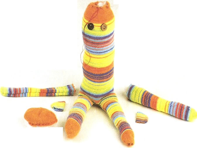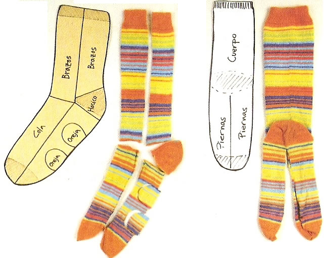 2. Corte primero el calcetín con el que te dará forma aL cuerpo y piernas. Cosa Las piernas y deje una abertura de un centímetro