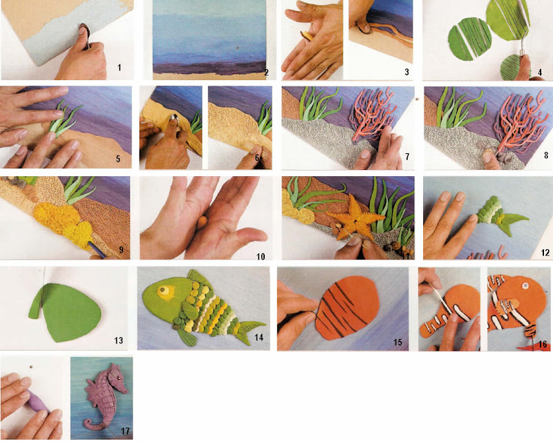 12.- Haga bolitas aplanadas de varios tonos de verde, blanco y amarillo y forme poco a poco el cuerpo del pez, sobreponiendo cada uno.